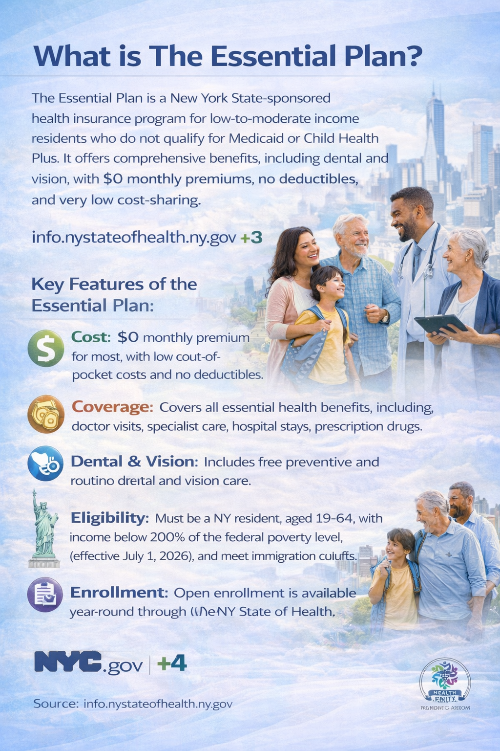 The Essential Plan is a New York State-sponsored health insurance program for low-to-moderate income residents who do not qualify for Medicaid or Child Health Plus. It offers comprehensive benefits, including dental and vision, with $0 monthly premiums, no deductibles, and very low cost-sharing.
